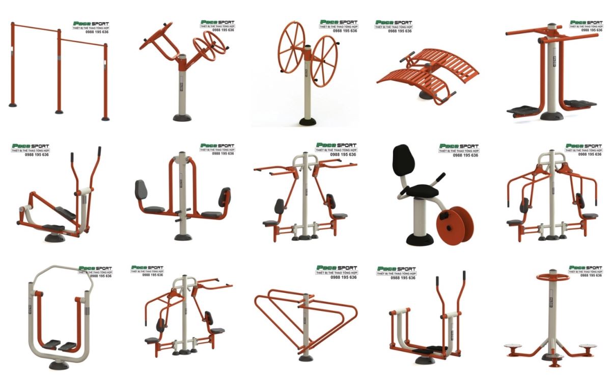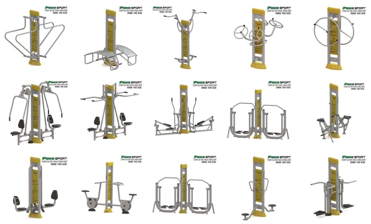 Thông thường bộ dụng cụ chủ yếu sẽ gồm: Dụng cụ đi bộ trên không, dụng cụ đi bộ lắc tay, dụng cụ tập đạp chân, dụng cụ tập toàn thân, dụng cụ tập xoay eo, dụng cụ tập xoay tay vai, dụng cụ đi bộ lắc tay, dụng cụ tập chèo thuyền, dụng cụ ngồi đạp xe đạp, dụng cụ tập kéo tay, dụng cụ tập đẩy tay, dục cụ tập kéo đẩy tay kết hợp, dụng cụ hít xà đơn, dục cụ tập lắc hông, dụng cụ tập xà kép....
