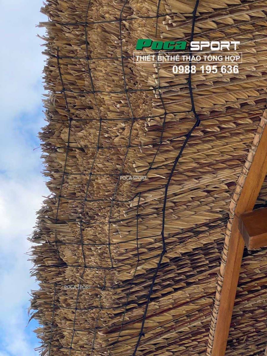 - Lưới phủ mái tranh đan bằng tay (sợi 2.5mm - 3.0mm ô 100mm - 120mm, màu xanh đậm hoặc màu đen) được phủ lớp chống UV giúp tăng cường độ bền màu, chống giòn gãy, chịu được thời tiết khắc nghiệt đảm bảo để sử dụng lâu dài (đặc biệt dùng cho vùng biển).