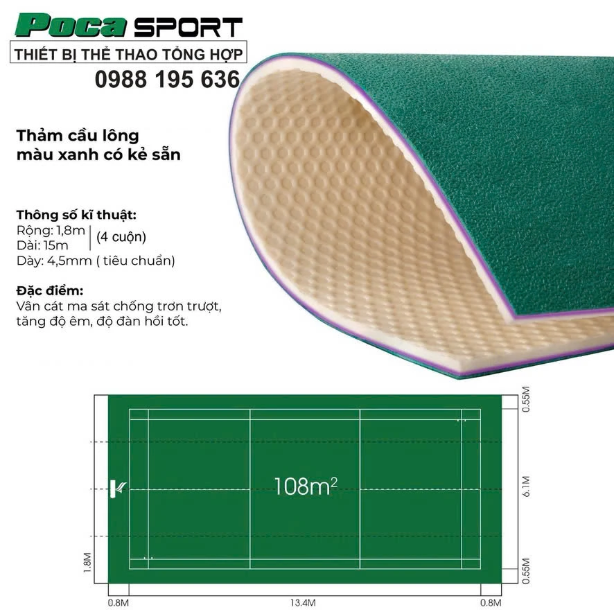 - 1 sân: gồm 4 cuộn 1,8m ghép lại ( thành 7,2m x 15m)