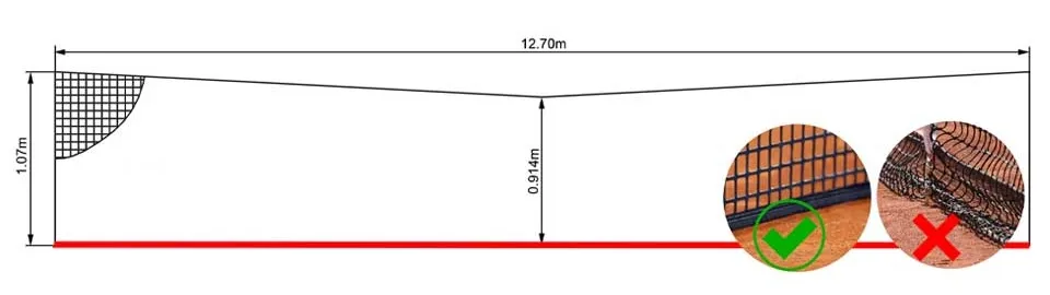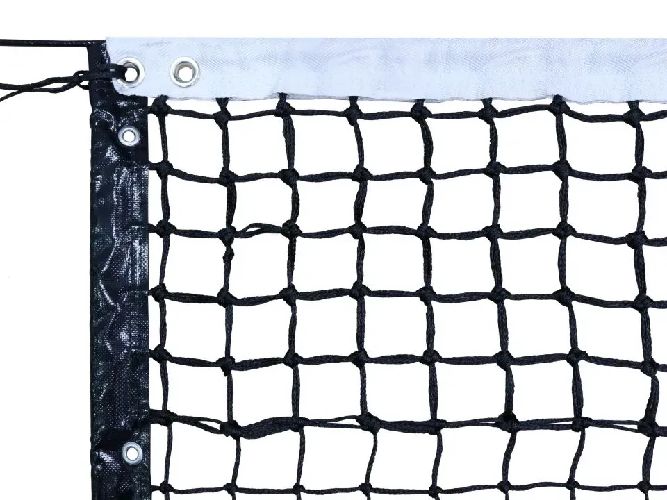- Lưới tennis đen sợi HDPE BR Ø2.5mm được xử lý kháng UV, ô lưới đơn 48mm với 6 ô lưới trên ô đôi, không thụng giữa. Chiều dài lưới 12.7m với băng trên PES trắng viền băng PVC xung quanh, giao kèm với băng giữa và cọc lưới.